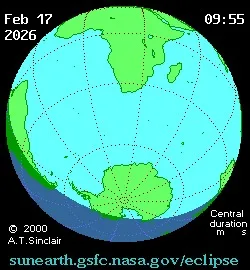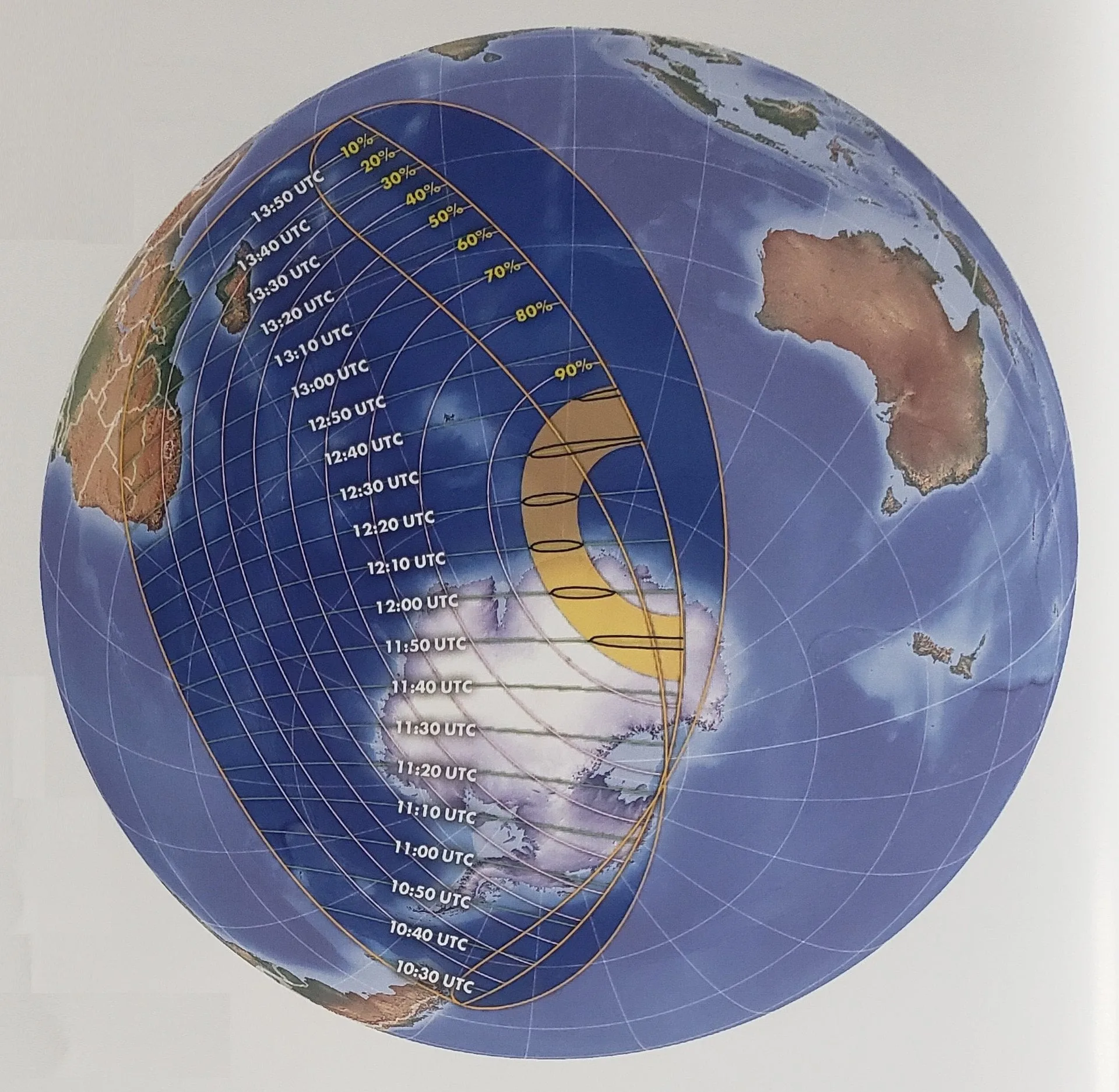 سایه ضد-تاریکی (antumbral shadow) ماه فقط به آرامی به سطح زمین میرسد و لبه قاره قطب جنوب را میخراشد. در واقع، قطب جنوب تنها بخش خشکی است که پدیده حلقوی (annularity) واقعاً بر آن فرود میآید. خارج از مسیر ۶۱۶ کیلومتری عرض این نوار، کسوف فقط به صورت جزئی دیده میشود. نوک جنوبی آمریکای جنوبی، آفریقا و ماداگاسکار تنها مناطق مسکونی دائمی هستند که اگر آسمان صاف باشد، کسوف جزئی خورشیدی را تجربه خواهند کرد.