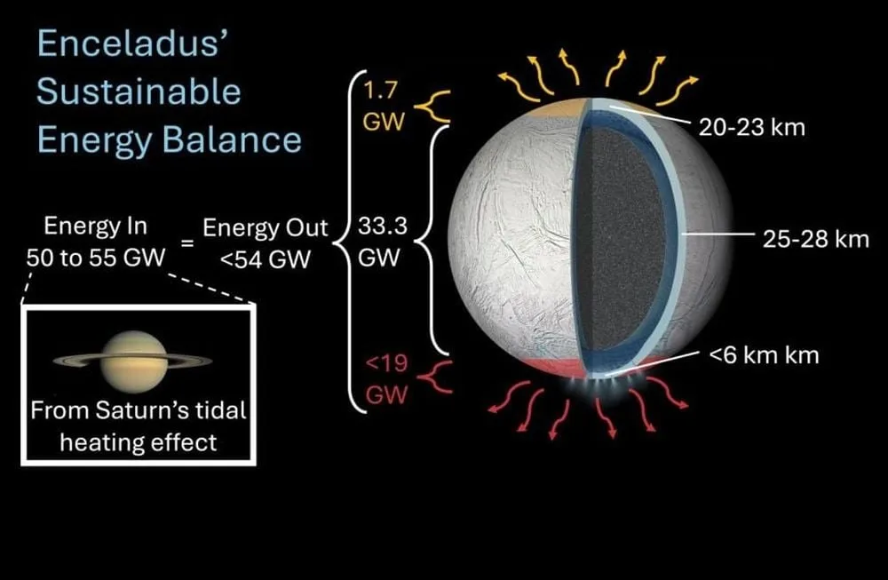 «بودجهٔ انرژی انسلادوس یک پارامتر حیاتی است، زیرا گرمای کشندی تولیدشده از تعامل این قمر با زحل – که به‌واسطهٔ رزونانس مداری آن با قمر دیون ایجاد می‌شود – مستقیماً با سن انسلادوس، ضخامت پوستهٔ یخی و در نتیجه عمر اقیانوس آن مرتبط است.»