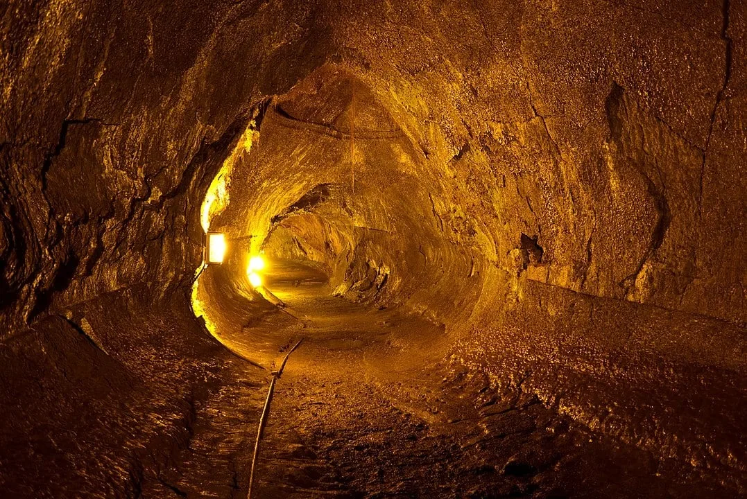 لولهٔ گدازهٔ تورستون در پارک ملی آتشفشان‌های هاوایی، هاوایی. علامت پله‌ای که در دیوارهٔ سمت راست واضح‌تر است، نشان‌دهندهٔ عمقی است که گدازه برای مدتی در آن جریان داشته است (اعتبار: فرانک شولنبرگ).