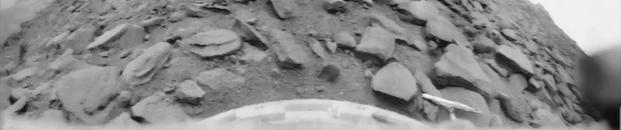 اولین نمای سطح زهره. نخستین تصویر پانورامای واضح که توسط فرودگر ونرا ۹ ثبت شد. این تصویر در طول عمر ۵۳ دقیقه‌ای فرودگر، در تاریخ ۲۲ اکتبر ۱۹۷۵ به زمین ارسال شد (اعتبار: تد استریک).